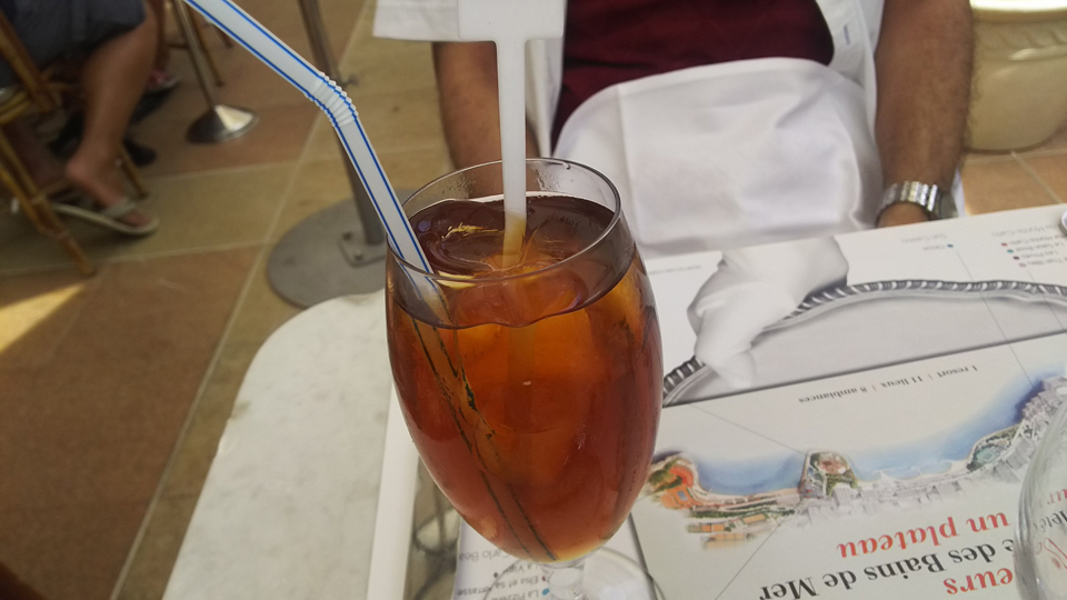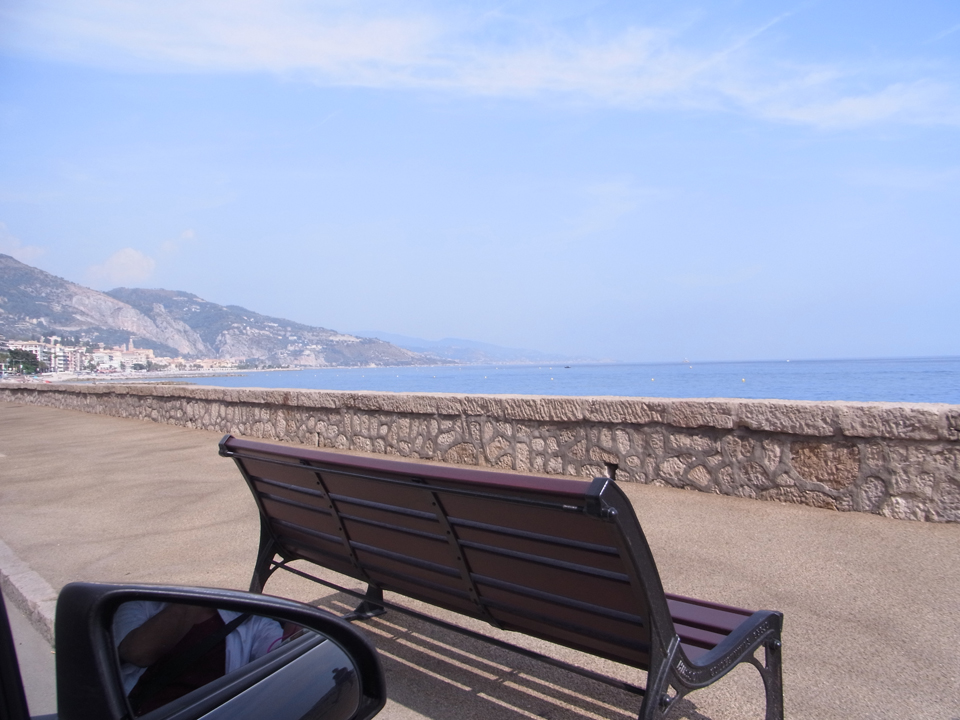 これがイタリアの景色。海岸沿いを走ってイタリア入るとすぐに右側にカフェがあるはずだったがまったくなく、車も止めれそうにない。あきらめて3キロほど走ると、1本山の手の道からフランスへ戻れる道があったのでそこでターンした。そのまま走ってるとなんと国境近くにカフェを発見!!本場のレモンチェッロ美味しかった♪ティラミス売り切れ |