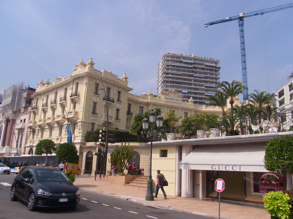 今日はモナコだけ!でも行きたいところがたくさんありすぎて、詰め込みすぎ。ホテルで朝食をとり、8:22発のTERで。モナコまでは20分。モナコ・モンテカルロ駅に着くと、サラリーマン風の人達が、たくさん歩いていて、オフィス街の駅のようだった。出口もこんな感じで近代的。やたらあちこちで工事している。 |