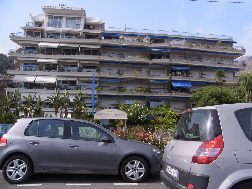 モナコグランプリのコースは普通に混んでてあまりスピードも出せないし、曲がるところもややこしい。そして、2周ずつ運転したので、いよいよイタリアへ。実はマントンも行きたかったけど時間がなくて行けなくなった。右の写真はマントンにあるホテル。何故写真撮ったのか覚えてなかったけど、ナポレオンという名前のホテルだったからかも。 |