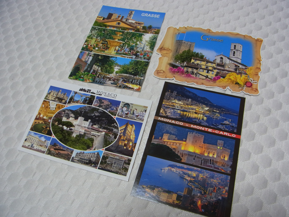 ショコラトリー・ド・モナコで買った王冠のチョコレート。2個入りですごく可愛いので10個くらい買った。あと右側のチョコレートは4種類のチョコが35枚くらい入っていて、すごく美味しかったので、大勢に配るのに最適でした。あとで近くを通った時に2袋買い足して、6袋くらい買った。一番右はモナコと昨日のグラースの絵はがき。 |