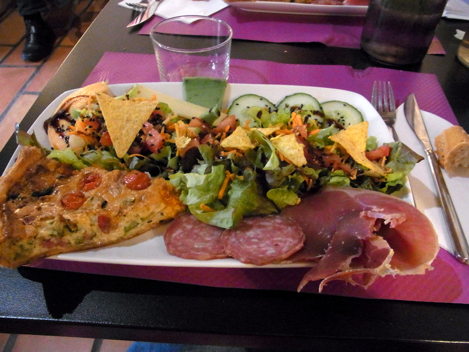 お昼はカリーヌさんが教えてくれたお薦めのレストランに行くことに。ただ、元々は時間があまりないので、地元のファーストフード店のようなところで食べる予定だったので、一応そちらも行ってみたが、閉まってた。このレストランはプリフィクスメニューみたいなのがあって、スープとプレートにしたけど、フランスでスープは珍しい! |