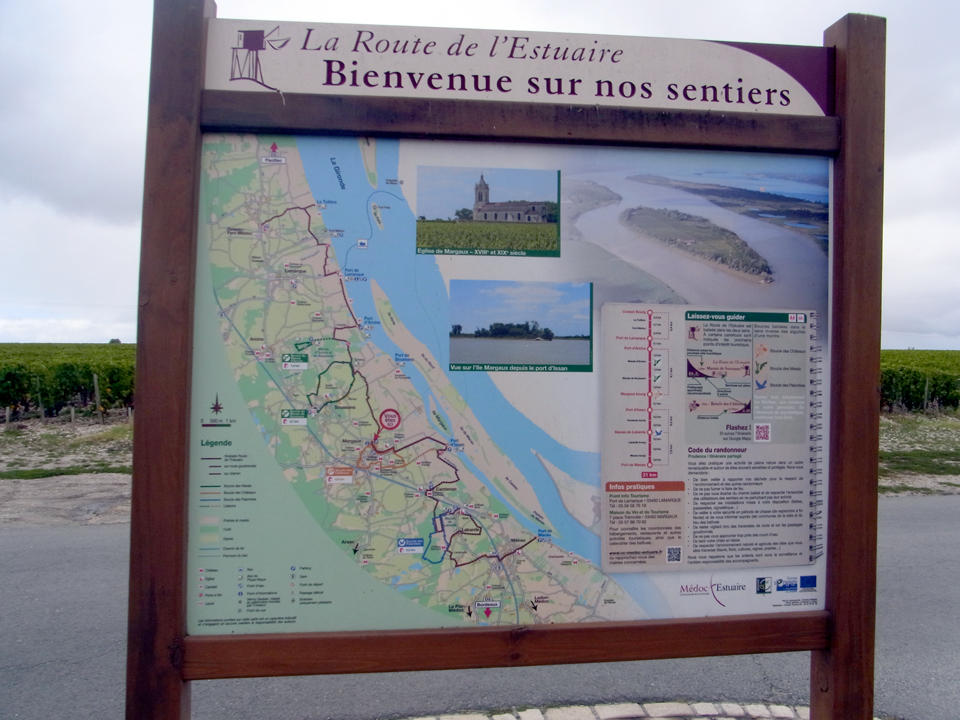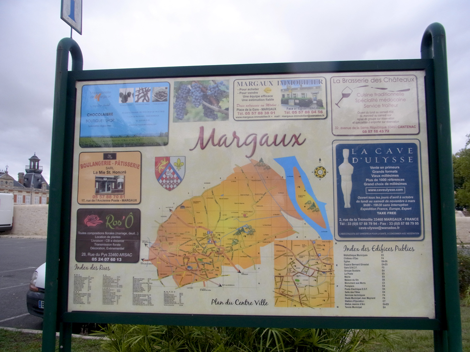 | 村の中の案内板がまたありました。シャトーはマルゴーやラスコンブなど、シャトー巡りのおすすめがでている。 |