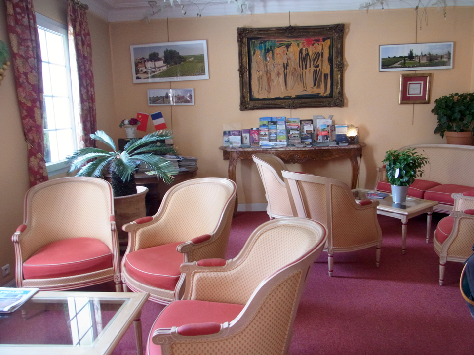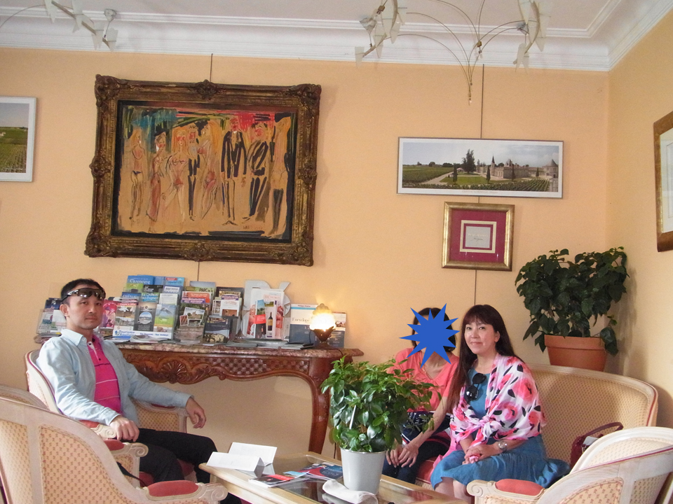 近くにシャトー・デゼランもあり、クリュ・モンプレジールの倉庫なんかもあります。その前を通ってシャトーラスコンブに到着。蔦の絡まるシャトーが歴史を感じさせます。事務所に行って、カリーヌさんと約束してるのですがというと、奥から真っ赤なワンピースで登場!雅叙園の時は紺のパンツスーツだったので、全然印象が違う! |