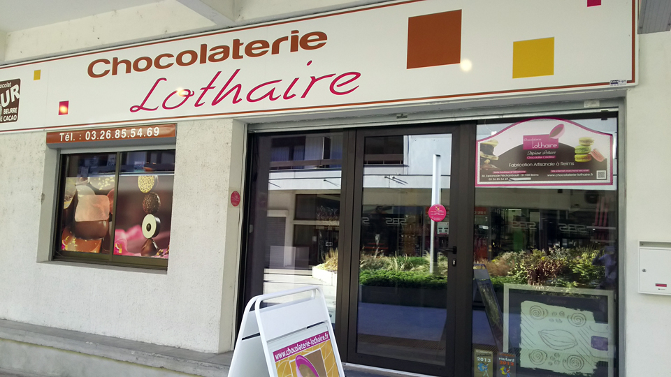 今日のメゾン訪問はすべて終了。3本もシャンパンを買ってしまい、自転車のカゴに3本積んで帰路につく。ポメリーを出たところにドゥモワゼル発見。ここも少し寄りたかったけど、時間がない。。。次の目的地はショコラティエのLOTHAIRE。ホテルの近くにもあるけど、帰り道で、サン・レミ教会の近くにあるお店に行ってみた。これがサン・レミ教会。 |