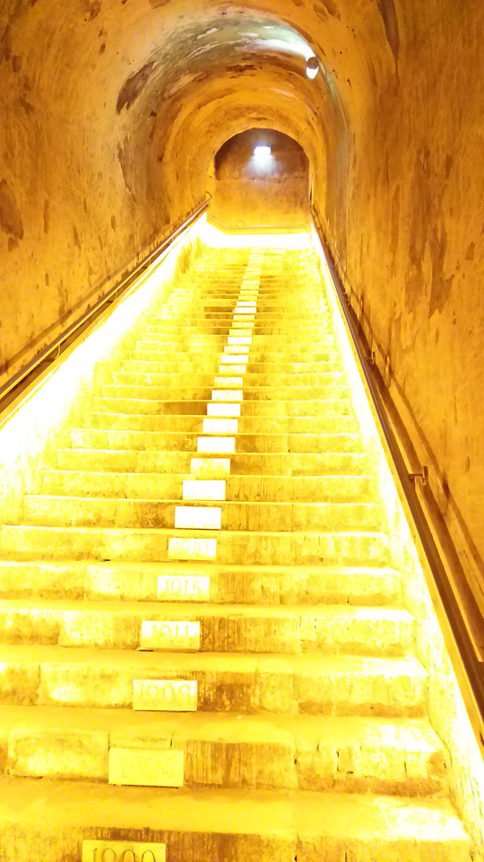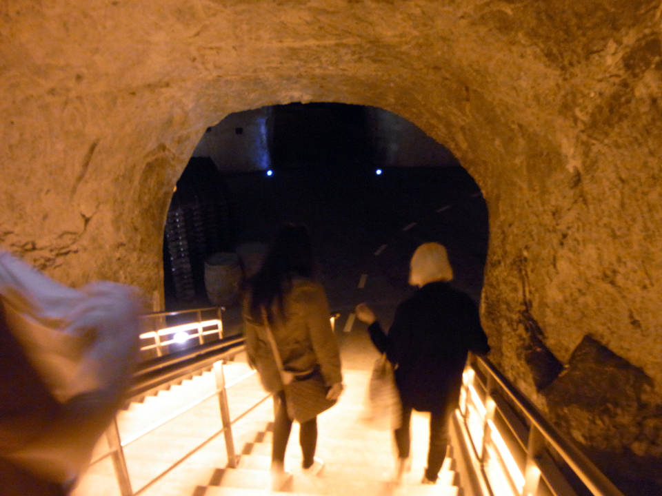 ヴーヴ・クリコに自転車で横付け(笑)ガードマンみたいな人がいて、自転車中に入れていいよーと言ってくれた。そして、ボディチェックもあって、建物の中に入る!時間が来るまで待合室で待機。シャンパーニュ地方の葡萄の産地の地図もあった。さて、いよいよ地下カーヴへ。やっぱりここにも壁画がある。昨日散々見たのでカーヴの写真は控えめ。 |