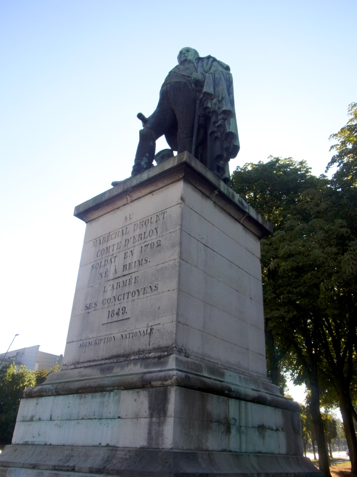 | さて、まず目指すはシャンパーニュ公園。グーグルマップでルート検索すると自転車で12分と出てくるが、とてもとても12分では着かない。半分くらいのところで、の辺に歩いてる女の人にシャンパーニュ公園の道を聞いたら、方向はあってるみたいだったが、ちょっと遠いよと言われた。途中に銅像があったのでパチリ。この人はドルエ・デルロン伯爵。ワーテルローの戦いで活躍した人らしくランス出身。 |
