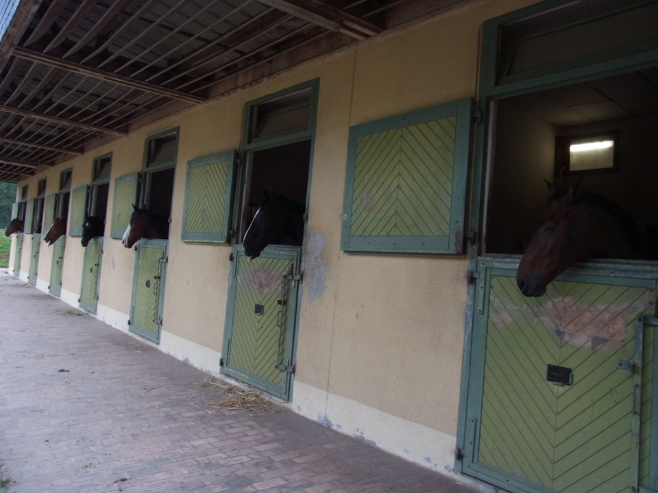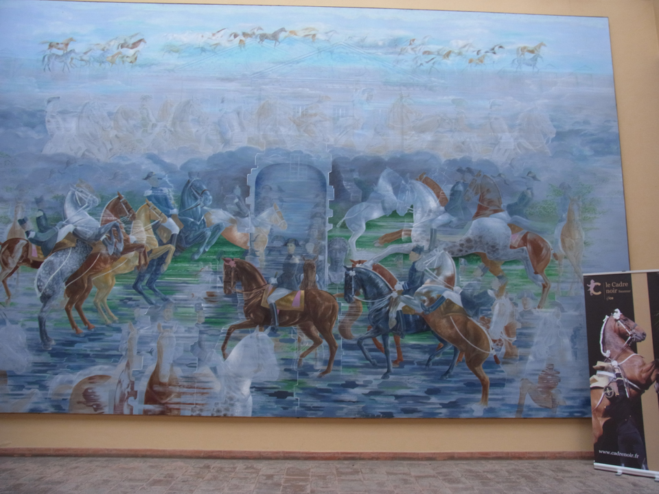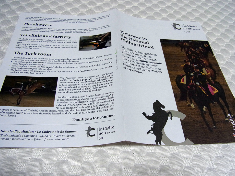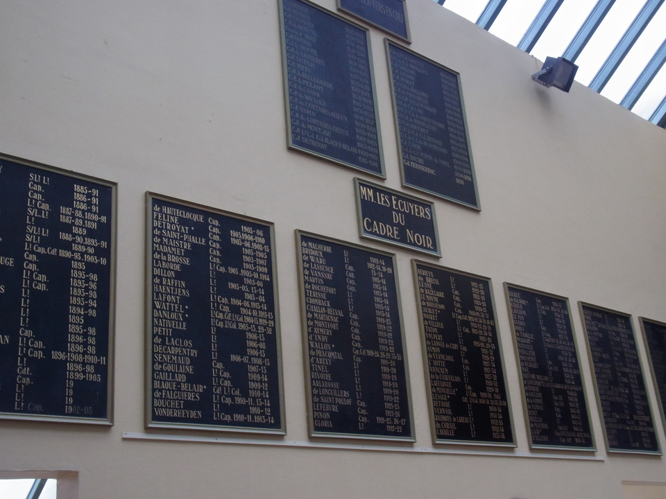 英語のパンフレットをもらえ。フランス語のが欲しいといったけど、すぐには出てこなくて、時間がなかったので帰りももらいに行けなかった。馬は可愛い〜。あと、バーバリー?の服着てるお馬さんもいた(笑)馬が日光浴する日焼けサロンみたいな部屋やシャワールームもあった。壁一面の大きな油絵が見事で、何か謂われがあるのかも〜その辺まったく聞き取れてないけど(^^;右の馬は、何度か口で鍵を開けようとしていて、脱走したいのかなーそれともパフォーマンスなのか。馬は賢いのでわからない(笑)カドル・ノワールは指導教官の集まりなので、7枚めの写真は教官の一覧とレベルかな? |