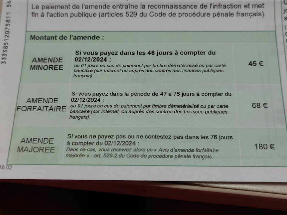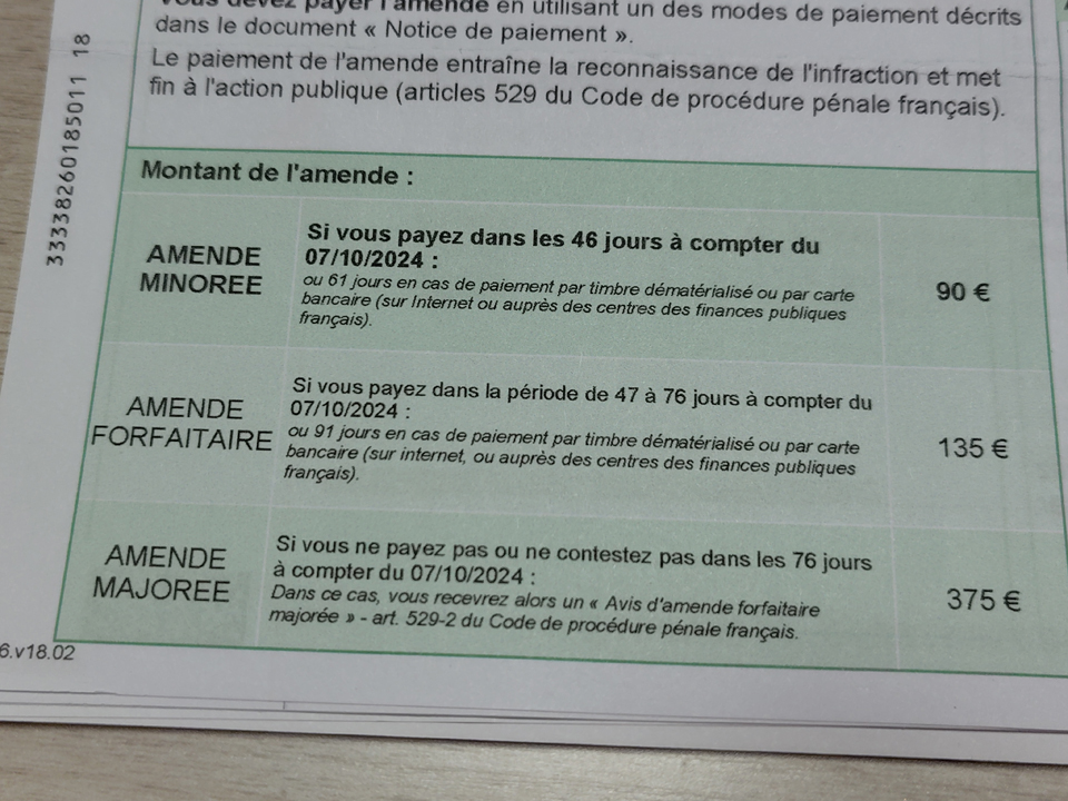 下の部分が反則金(写真上右)、違反してから46日以内だと90€、76日までが135€、それを過ぎると375€って62000円やん!それも1か月くらい経ってから送ってきて・・・結局その2つ90€×2をすぐに払った。 |