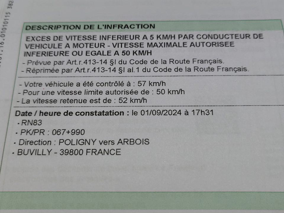 場所はポリニーからアルボアの間で時間も書いてある。実は30分くらいの差で2枚来てて、コンテチーズ博物館に向かう途中の雨の中の時間でも1枚、2キロの違反で来てた。
