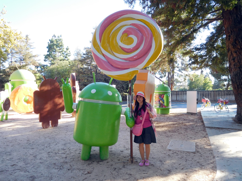 近くにグーグルの本社あるそうなので、それならぜひ行ってみたいなということで連れて行ってもらった。グーグルの敷地はすごく広くて社員の人が使うカラフルな自転車があちこちに置いてあって、それに乗って写真撮ってる人もいた(笑)ただ、この自転車は結構盗まれてるらしい。グーグルショップの裏手に公園があり、そこにドロイドくんとか |