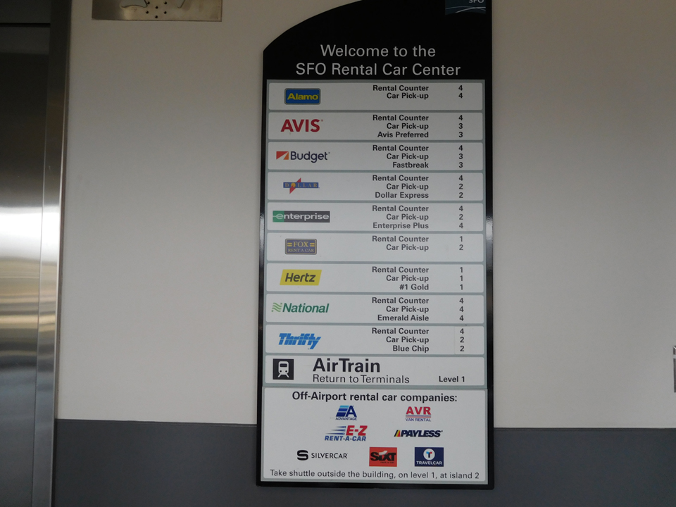| サンフランシスコ空港のレンタカーはレンタカーセンターというところにレンタカー会社が集まっています。そこまでの移動には空港内を無料運行しているエアトレイン(ブルーライン)を使うと便利らしく、今回はMくんにそのセンターまで送ってもらいましたが、着いた日にインフォメーションで場所を確認しておきました。今回はダイナースにお得なプランのあったDOLLERを予約しました。左下の写真はたぶんモリーストーンズの駐車場から見つけたバンクオブアメリカ。だーりんが撮ったと思われる(笑) |