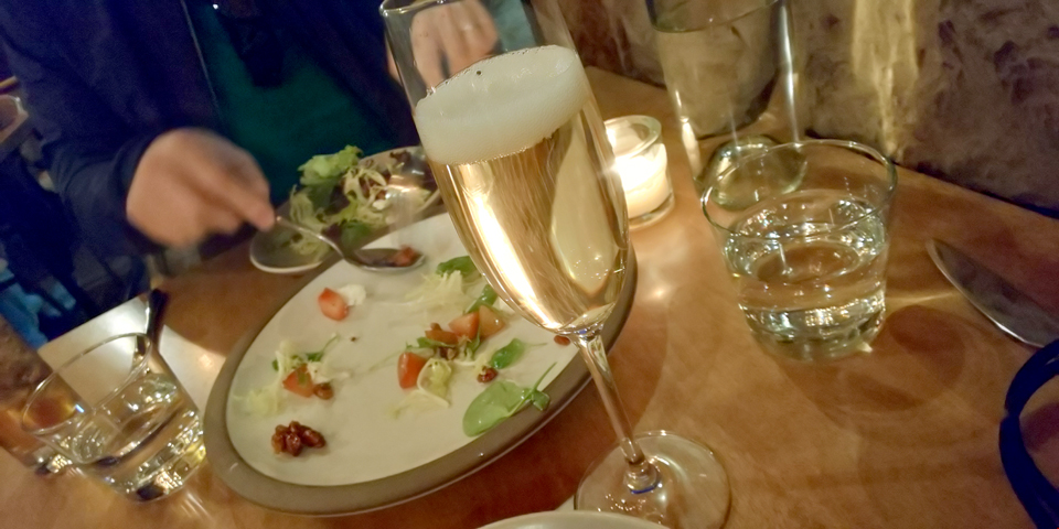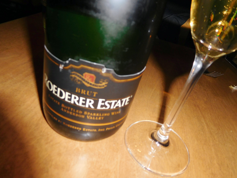 レストランは予約してあったのにもかかわらず、10分ほど待たされるし、案内された席は半分外のような席だった。ナパのあたりでも夜は結構寒い。ルイ・ロデレールのスパークリングがあったのでそれにした。ほんとにフランスのシャンパンメゾンがこぞってナパでスパークリング作ってるなー。 |