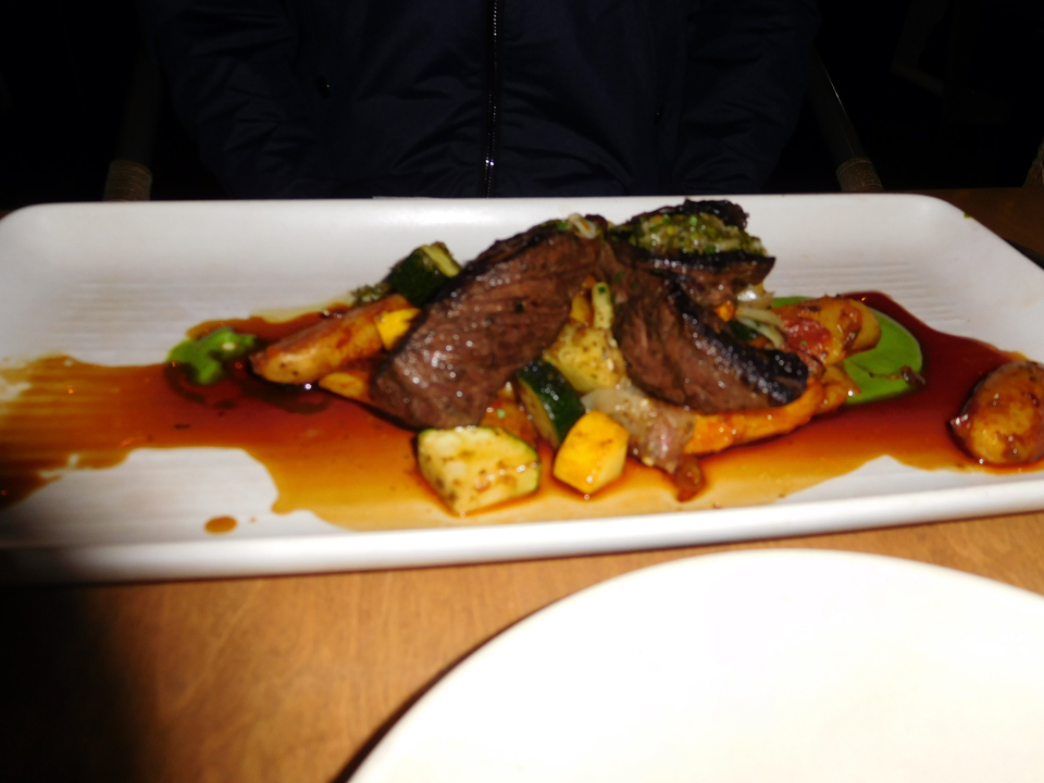 | シェーヴル・サラダに、リゾットに、ステーキ。アメリカの割に量は普通だし、料理もわりと美味しかった。帰りはもう暗かったしウーバーを使ってホテルに戻った。 |
