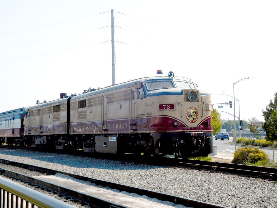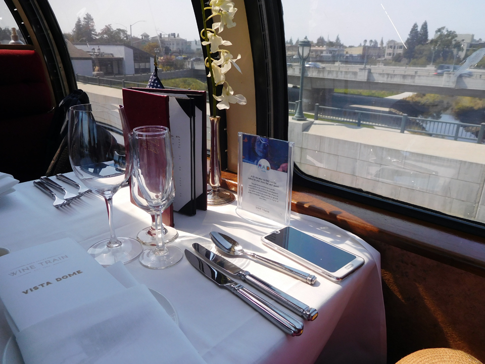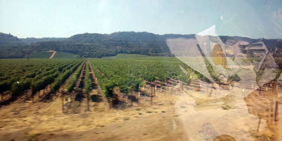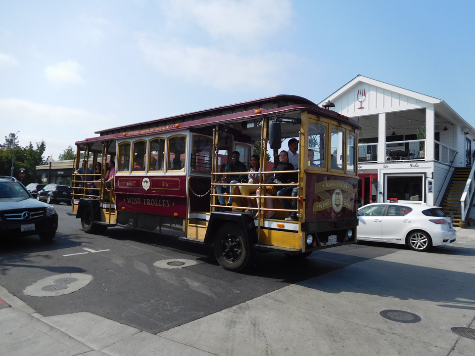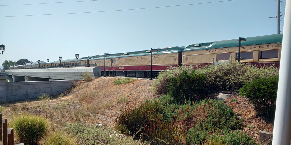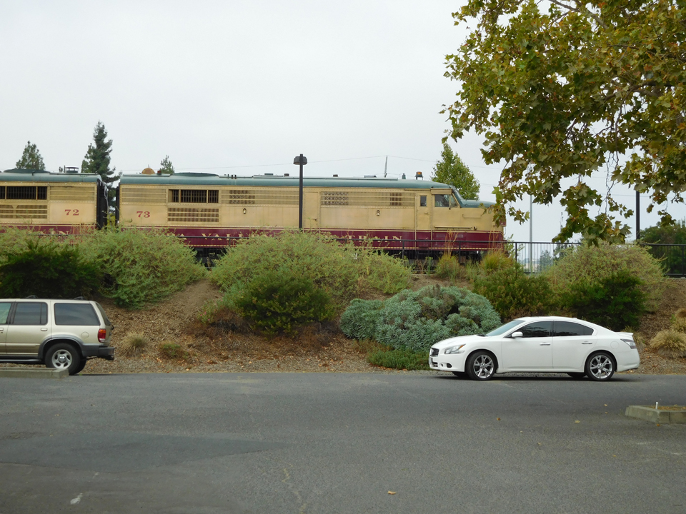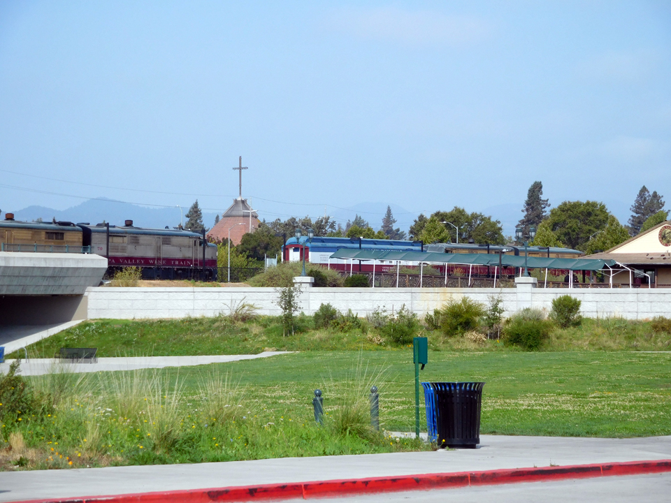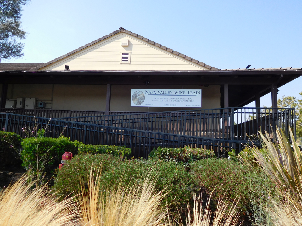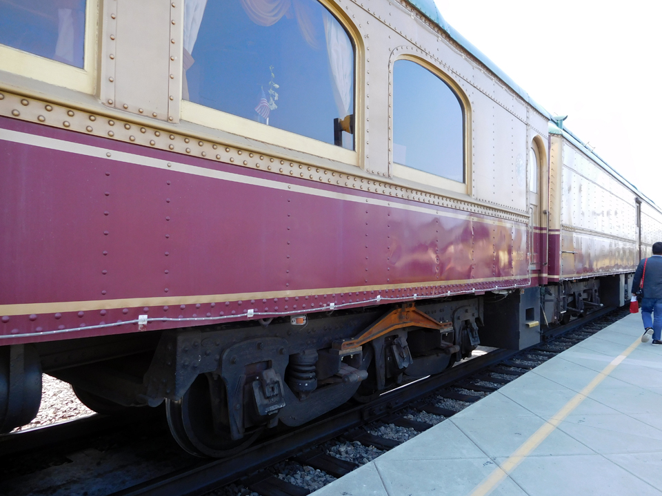 | 次はいったんホテルへ戻って車でロバート・モンダヴィへ。ところが、カメラマンが撮ってくれた写真を見て購入するかどうかの行列があり、ここでかなり時間を取られてしまう。ナパ駅に列車が戻ってきたのも14時半過ぎてたし、写真の購入で時間かかり、止まってる列車の前から写真撮ったりして、結局ワイントレインを終了したのは15時過ぎ。ワイントレインからホテルまではウーバーで。 |