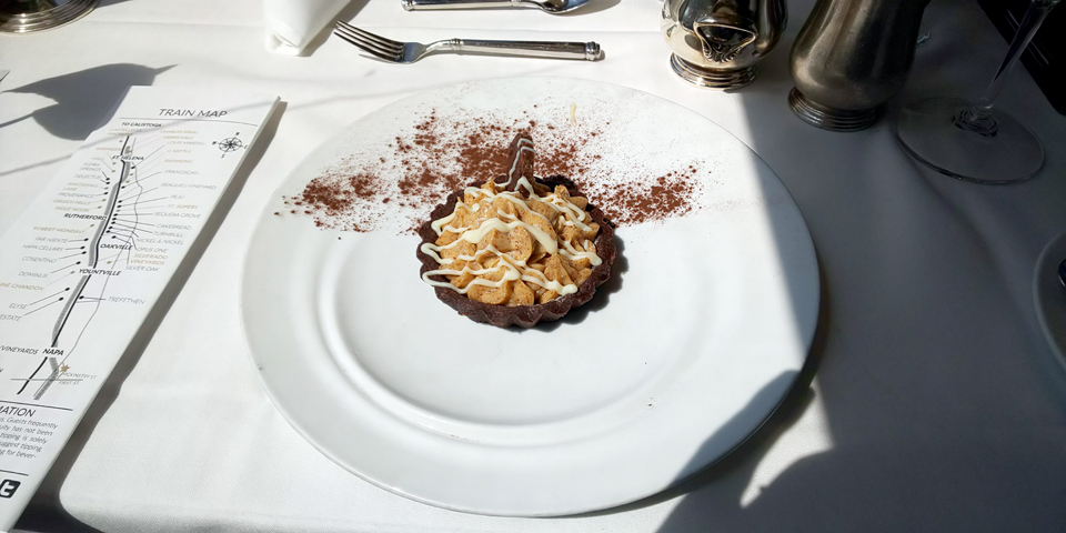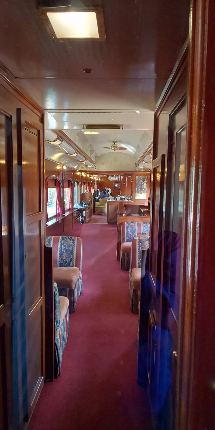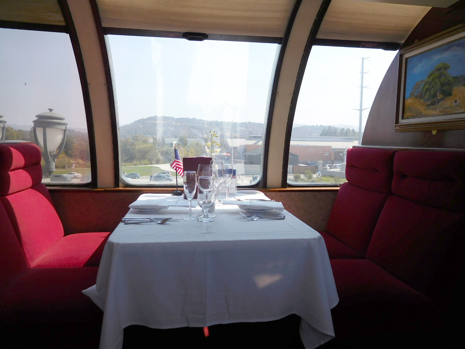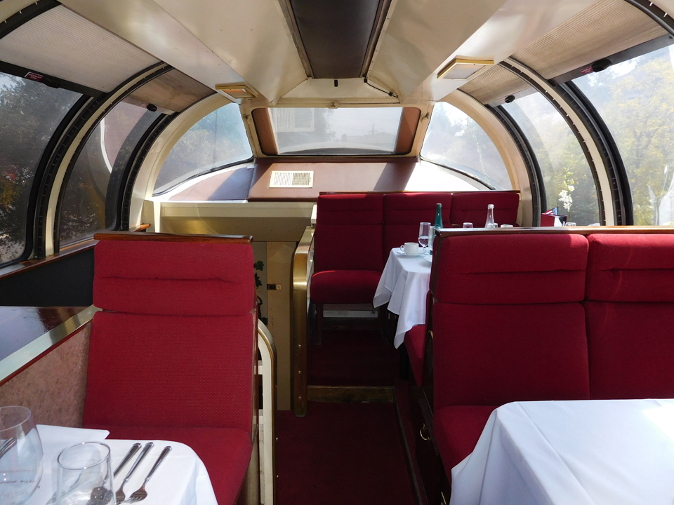 メインが終わったところで、テーブル担当のおじさんから、デザートは14時からなので、あちこち見て回るといいよと言われたので、トレインの中を探検。列車のつなぎ部分のデッキから動画も撮ったりして楽しかった。でもビスタドーム以外のところは結構すいていた。 |