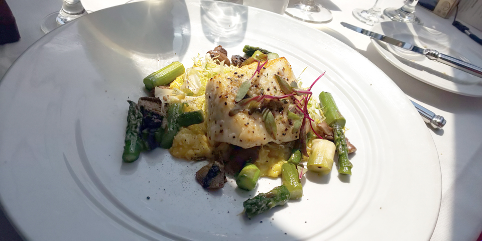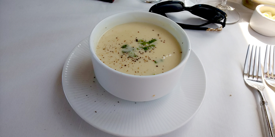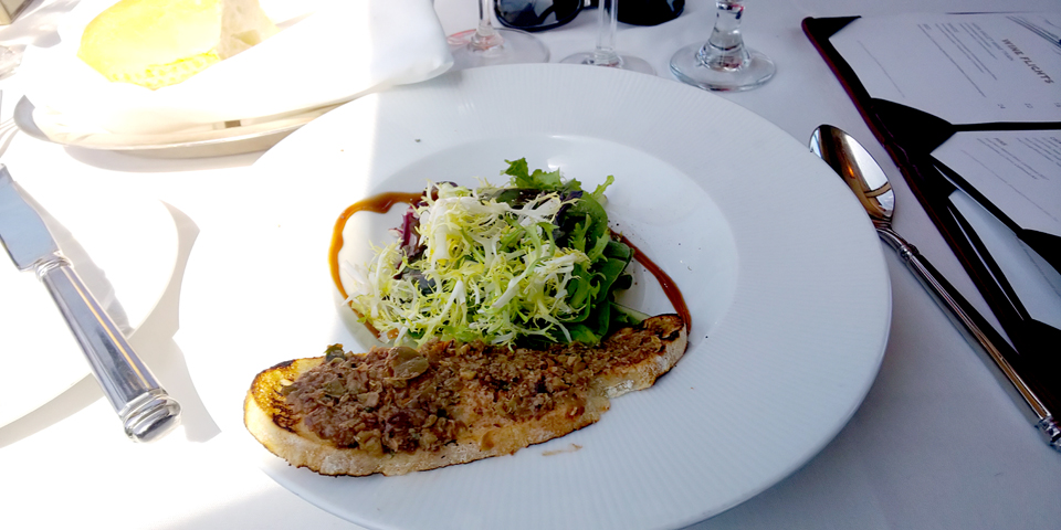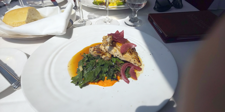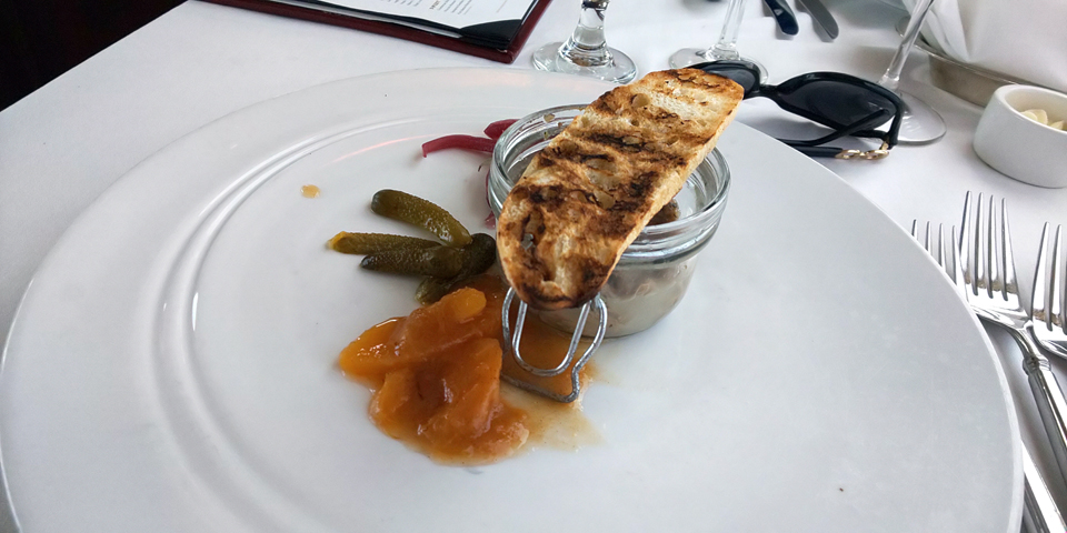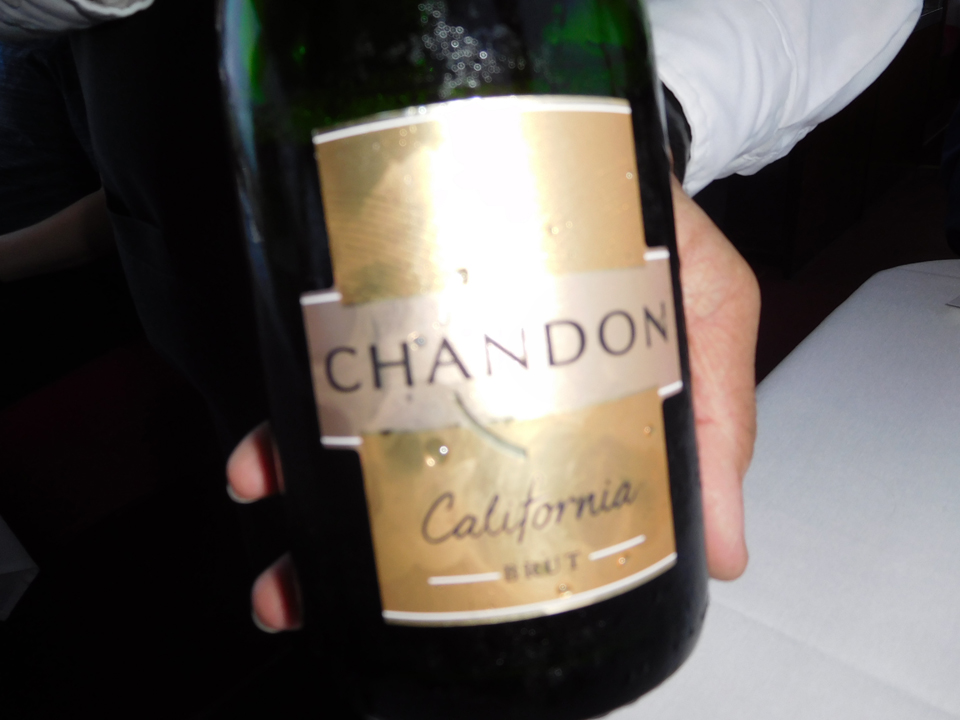 そして、最初のウエルカムドリンクはドメーヌ・シャンドンのスパークリングでした。右の写真がテーブル担当のおじさんが撮ってくれた写真。メニューから前菜2種類、メイン、デザートを選び、それぞれの料理に合うおすすめワインも書いてある。ガチョウのコンフィ、クラムチャウダーは美味しかった♪ただ、メインはどれも食材があまり好きでは |