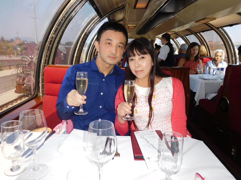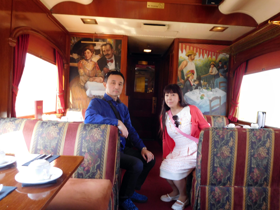 | 電車に乗る前に、カメラマンによる撮影があった。座席でも撮ってくれたけど、座席の写真は中のテーブル担当のおじさんが撮ってくれた方がよく写っていたので、電車の前の写真だけを買った。紙ベースの写真は要らないのでダウンロード版。色んなフレームのものがダウンロード出来てなかなかよかった。27.26ドル。 |