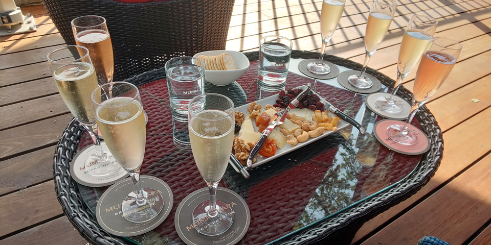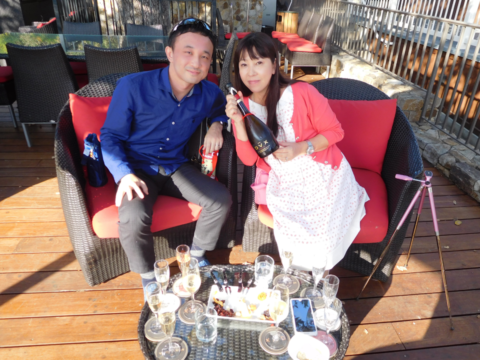 | マムはランスにあるシャンパーニュメゾンにも行ったけど、フランスとまた趣が全然違う。お花とか咲いててカントリー調。せっかくなのでチーズやナッツも注文。オークテラスだと、椅子もすごくゆったりしている。最初は4種類、それもナミナミと注がれてびっくり!そして私の手に持ってるのがDVX。ボトルだけの写真撮るの忘れた。だーりんが飲めない分まで結構飲んだのでいい感じで酔っ払ってる。 |