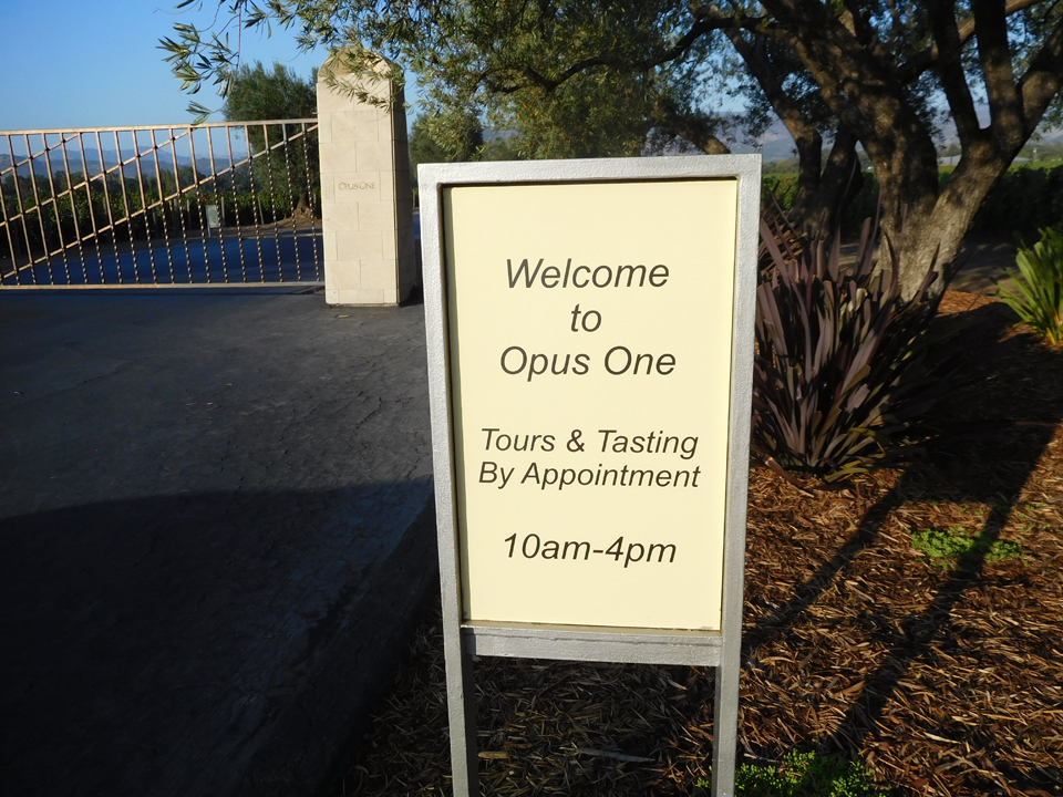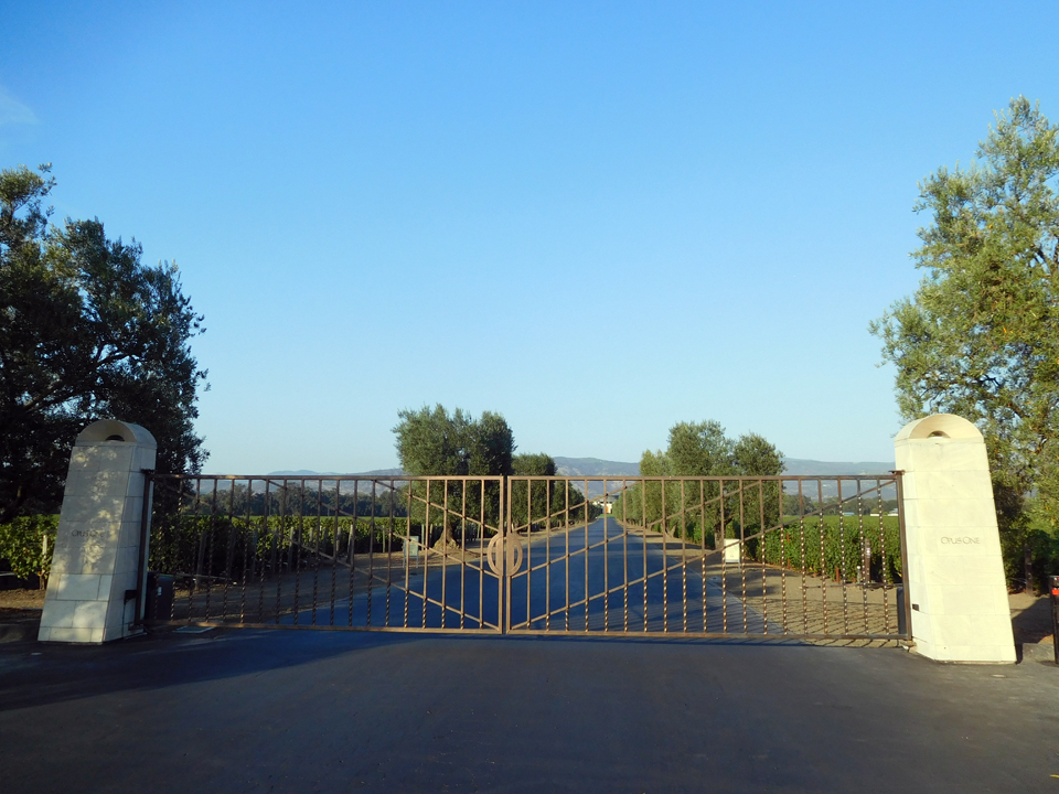 そして次に行ったのはオーパスワン。さっき電車からも見えていた。オーパスワンはムートンとモンダヴィの合弁事業として設立された。去年ムートンに行った時も、オーパスワンのボトルが置いてあった。ただ一度飲んでるのと、カベソーなので好みの味ではなかったし、だーりんが赤ワインそんなに好きではないので試飲はパスした。ただ、時間的には門も閉まってるので、外からの撮影のみ。 |