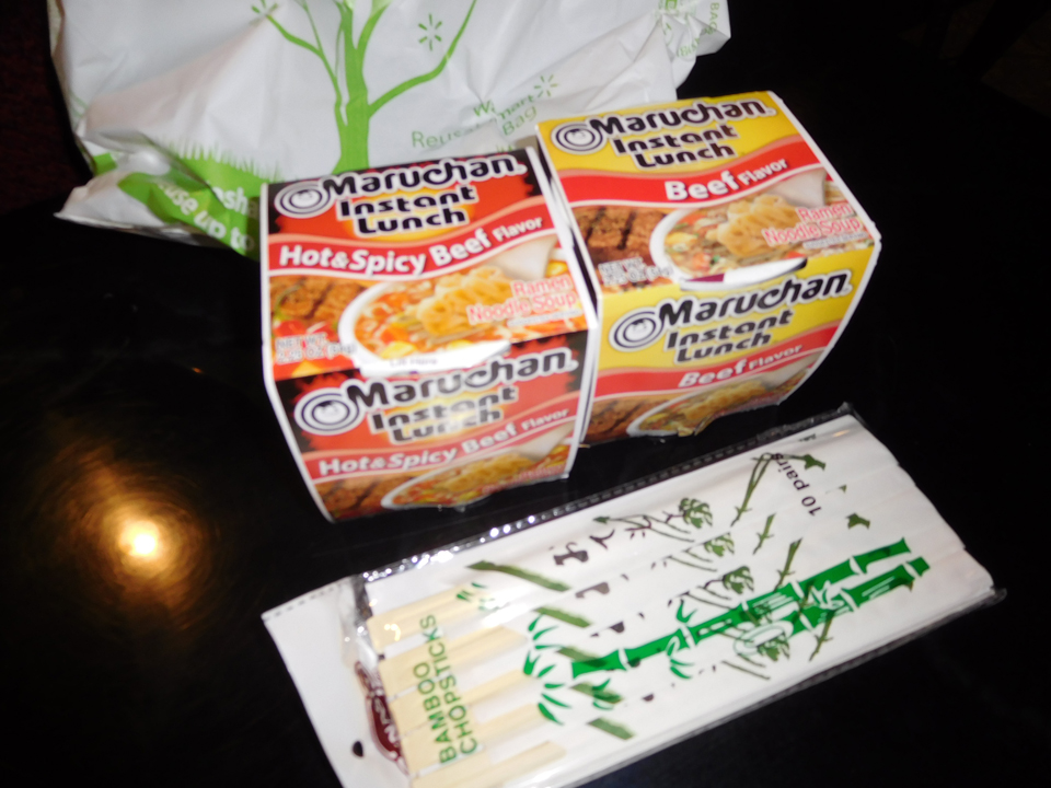 | 夕食はホテルの近くの軽く食べれるレストランに行く予定だったけど、ワイントレインの昼食が響いてて、軽くも食べる気がしない。だーりんのかかとへの振動に伴う痛みがひどくなってきたのでウォルマートへバンデージを買いに。ついでに面白いラーメンがあったので、夕食はこれにした(笑) |