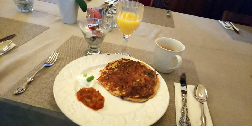 今はワイントレインの駅に10時に行けばいいので、少しゆっくり。朝食はオーナーが作ってくれるお好み焼きのようなパンケーキ(笑)まあまあいける。ただ、このデザートがイマイチだったけど。。この日の朝食は5組くらいいて賑わっていた。このダイニングがほぼ満席。だーりんの足が万全なら散歩がてらワイントレインの駅まで歩いていくけど |